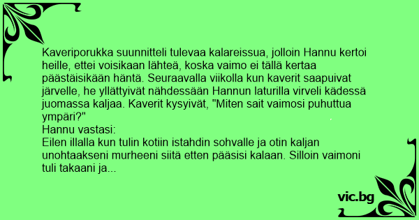 Kaveriporukka suunnitteli tulevaa kalareissua, jolloin Hannu kertoi heille, ettei voisikaan lähteä, koska vaimo ei tällä kertaa päästäisikään häntä. Seuraavalla viikolla kun kaverit saapuivat järvelle, he yllättyivät nähdessään Hannun laturilla virveli kädessä juomassa kaljaa. Kaverit kysyivät, "Miten sait vaimosi puhuttua ympäri?"