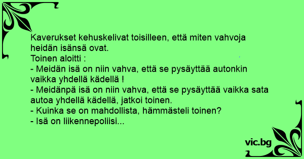 - Meidänpä isä on niin vahva, että se pysäyttää vaikka sata autoa yhdellä kädellä, jatkoi toinen.