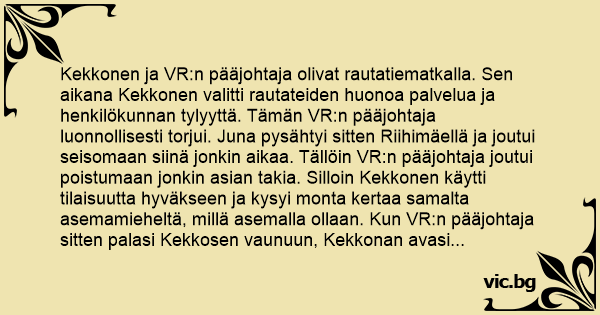 Kekkonen ja VR:n pääjohtaja olivat rautatiematkalla. Sen aikana Kekkonen valitti rautateiden huonoa palvelua ja henkilökunnan tylyyttä. Tämän VR:n pääjohtaja luonnollisesti torjui. Juna pysähtyi sitten Riihimäellä ja joutui seisomaan siinä jonkin aikaa. Tällöin VR:n pääjohtaja joutui poistumaan jonkin asian takia. Silloin Kekkonen käytti tilaisuutta hyväkseen ja kysyi моnта kertaa samalta asemamieheltä, millä asemalla ollaan. Kun VR:n pääjohtaja sitten palasi Kekkosen vaunuun, Kekkonan avasi ikkunan ja kysyi jälleen: