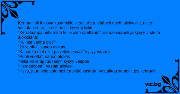 Kenraali oli tulossa kasarmille vierailulle ja vääpeli opetti alokkaille, miten vastata kenraalin esittämiin kysymyksiin.