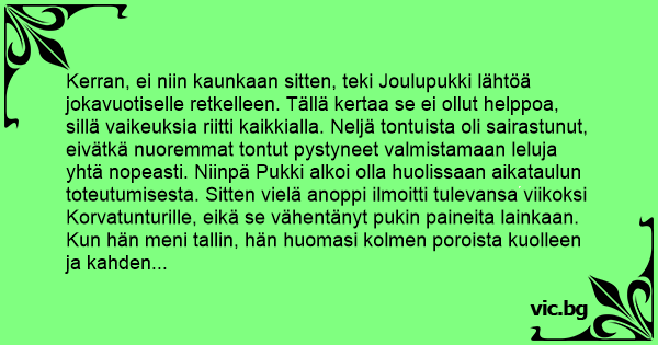 Kerran, ei niin kaunkaan sitten, teki Joulupukki lähtöä jokavuotiselle retkelleen. Tällä kertaa se ei ollut helppoa, sillä vaikeuksia riitti kaikkialla. Neljä tontuista oli sairastunut, eivätkä nuoremmat tontut pystyneet valmistamaan leluja yhtä nopeasti. Niinpä Pukki alkoi olla huolissaan aikataulun toteutumisesta. Sitten vielä anoppi ilmoitti tulevansa viikoksi Korvatunturille, eikä se vähentänyt pukin paineita lainkaan. Kun hän meni tallin, hän huomasi kolmen poroista kuolleen ja kahden muun loikanneen luoja ties minne. Lisää stressiä. Kun hän lopulta alkoi valjastaa loppuja poroja reen eteen, toinen valjaista katkesi ja reki kaatui. Suurin osa lahjoista säkyi pudotessaan maahan. Turhautuneena Pukki meni pirttiin ottaakseen kupin kahvia ja kunnon viskipaukun, mutta tontut olivat löytäneet hänen viinakaappinsa, eikä siellä ollut mitään juotavaa. Hermostuksissaan hän pudotti kahvikuppinsa. Kupin pienet sirpaleet pyörivät pitkin pitin lattiaa. Pukki meni hakemaan luutaa, mutta hiiret olivat jyrsineet sen kaikki harjakset poikki. Juuri silloin soi ovikello. Pukki avasi oven, sen takana oli pieni enkeli suuren tuuhean joulukuusen kanssa. Ja se pieni enkeli kysyi: