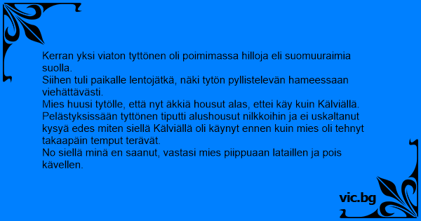 Pelästyksissään tyttönen tiputti alushousut nilkkoihin ja ei uskaltanut kysyä edes miten siellä Kälviällä oli käynyt ennen kuin mies oli tehnyt takaapäin temput terävät.