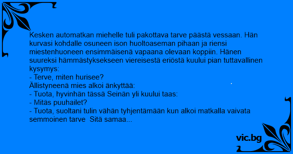 Kesken automatkan miehelle tuli pakottava tarve päästä vessaan. Hän kurvasi kohdalle osuneen ison huoltoaseman pihaan ja riensi miestenhuoneen ensimmäisenä vapaana olevaan koppiin. Hänen suureksi hämmästyksekseen viereisestä eriöstä kuului pian tuttavallinen kysymys: