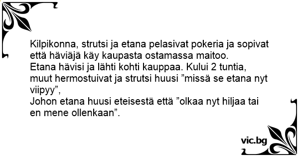 Kilpikonna, strutsi ja etana pelasivat pokeria ja sopivat että häviäjä käy kaupasta ostamassa maitoo.