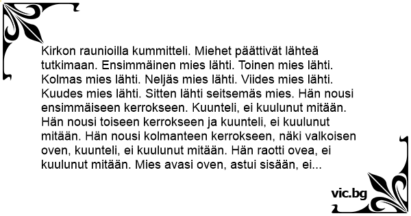 Kirkon raunioilla kummitteli. Miehet päättivät lähteä tutkimaan. Ensimmäinen mies lähti. Toinen mies lähti. Kolmas mies lähti. Neljäs mies lähti. Viides mies lähti. Kuudes mies lähti. Sitten lähti seitsemäs mies. Hän nousi ensimmäiseen kerrokseen. Kuunteli, ei kuulunut mitään. Hän nousi toiseen kerrokseen ja kuunteli, ei kuulunut mitään. Hän nousi kolmanteen kerrokseen, näki valkoisen oven, kuunteli, ei kuulunut mitään. Hän raotti ovea, ei kuulunut mitään. Mies avasi oven, astui sisään, ei kuulunut eikä näkynyt mitään. (Lopuksi kiljaistaan, jotta kuuntelijat pelästyvät.)