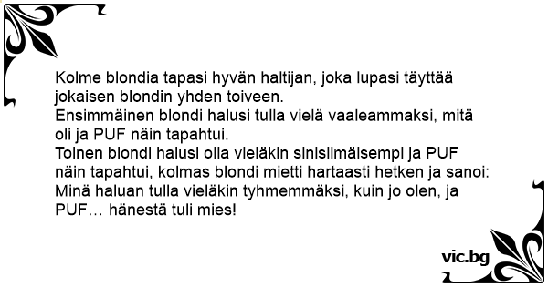 Toinen blondi halusi olla vieläkin sinisilmäisempi ja PUF näin tapahtui, kolmas blondi mietti hartaasti hetken ja sanoi: