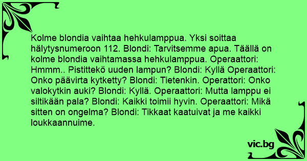 Kolme blondia vaihtaa hehkulamppua. Yksi soittaa hälytysnumeroon 112. Blondi: Tarvitsemme apua. Täällä on kolme blondia vaihtamassa hehkulamppua. Operaattori: Hmmm.. Pistittekö uuden lampun? Blondi: Kyllä Operaattori: Onko päävirta kytketty? Blondi: Tietenkin. Operattori: Onko valokytkin auki? Blondi: Kyllä. Operaattori: Mutta lamppu ei siltikään pala? Blondi: Kaikki toimii hyvin. Operaattori: Mikä sitten on ongelma? Blondi: Tikkaat kaatuivat ja me kaikki loukkaannuime.