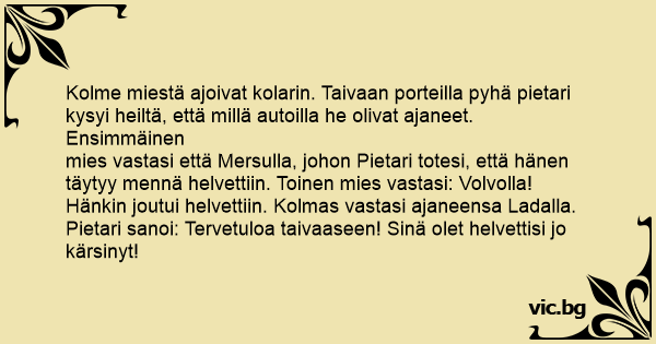 mies vastasi että Mersulla, johon Pietari totesi, että hänen täytyy mennä helvettiin. Toinen mies vastasi: Volvolla! Hänkin joutui helvettiin. Kolmas vastasi ajaneensa Ladalla. Pietari sanoi: Tervetuloa taivaaseen! Sinä olet helvettisi jo kärsinyt!
