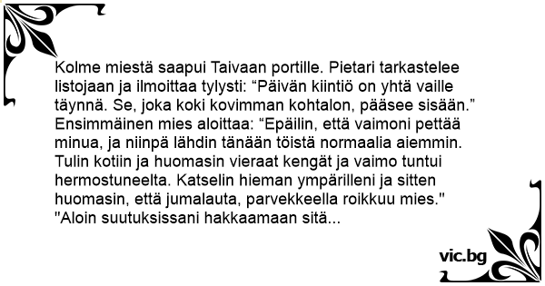 Kolme miestä saapui Taivaan portille. Pietari tarkastelee listojaan ja ilmoittaa tylysti: “Päivän kiintiö on yhtä vaille täynnä. Se, joka koki kovimman kohtalon, pääsee sisään.”