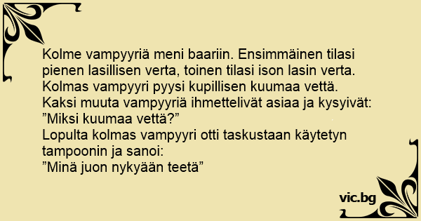 Един ден двама вампири влезли в бар. Първият казал: - Чаша топла кръв, ако обичате. - Веднага - отвърнал барманът. - А вие? - Чаша гореща вода - обадил се вторият вампир. След няколко минути барманът се върнал с чаша топла кръв и гореща вода и казал: - Вие сте вампири, нали? Щом пиете кръв......