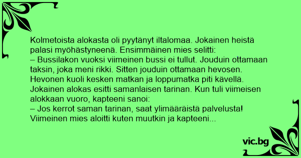 Kolmetoista alokasta oli pyytänyt iltalomaa. Jokainen heistä palasi myöhästyneenä. Ensimmäinen mies selitti: