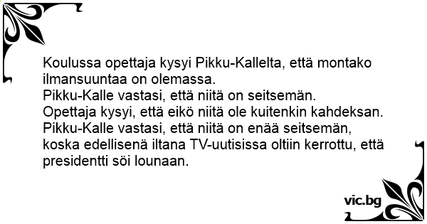 Koulussa opettaja kysyi Pikku-Kallelta, että montako ilmansuuntaa on olemassa.