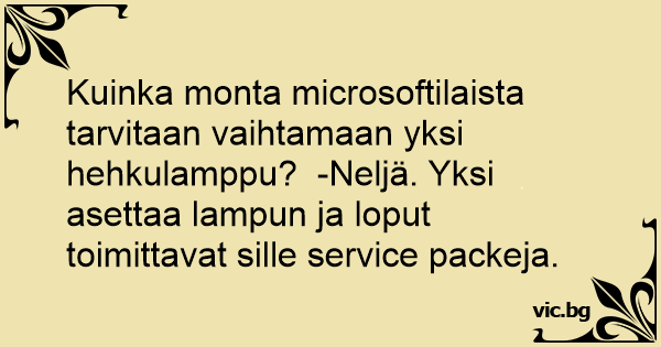 Kuinka моnта microsoftilaista tarvitaan vaihtamaan yksi hehkulamppu? -Neljä. Yksi asettaa lampun ja loput toimittavat sille service packeja.
