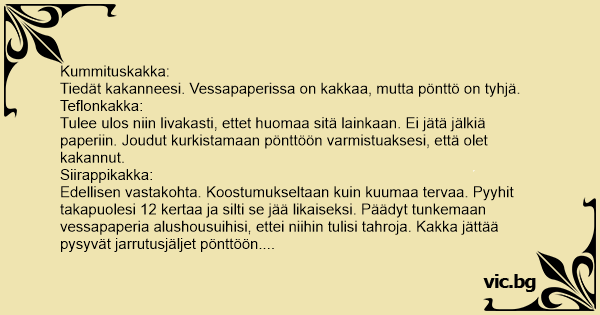 Tämä kakka tulee kankkuspäivänä. Luulet, että kakka ei haise niin pahalta, mutta tämä ON paha. Useimmiten joku odottaa vuoroaan käyttää vessaa. Myös tämä kakka tulee usein ollessasi kyläilemässä.