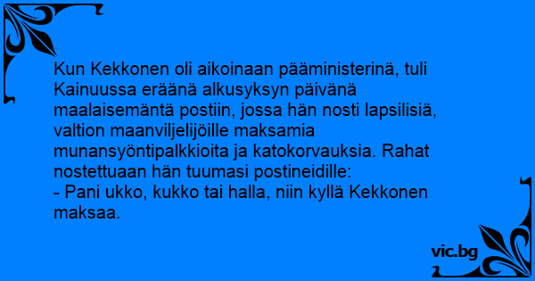 Kun Kekkonen oli aikoinaan pääministerinä, tuli Kainuussa eräänä alkusyksyn päivänä maalaisemäntä postiin, jossa hän nosti lapsilisiä, valtion maanviljelijöille maksamia munansyöntipalkkioita ja katokorvauksia. Rahat nostettuaan hän tuumasi postineidille: