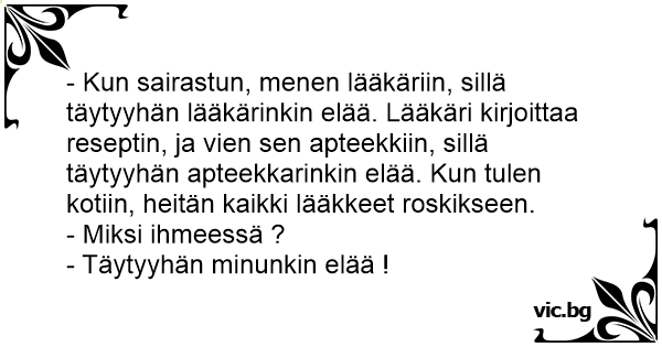 - Kun sairastun, menen lääkäriin, sillä täytyyhän lääkärinkin elää. Lääkäri kirjoittaa reseptin, ja vien sen apteekkiin, sillä täytyyhän apteekkarinkin elää. Kun tulen kotiin, heitän kaikki lääkkeet roskikseen.