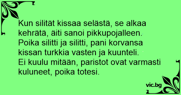 Kun silität kissaa selästä, se alkaa kehrätä, äiti sanoi pikkupojalleen.<br />Poika silitti ja silitti, pani korvansa kissan turkkia vasten ja kuunteli.<br />Ei kuulu mitään, paristot ovat varmasti kuluneet, poika totesi.