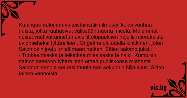 Kuningas Salomon valtaistuinsaliin ilmestyi kaksi vanhaa naista, jotka raahasivat välissään nuorta miestä. Molemmat naiset vaativat annetun avioliittolupauksen nojalla nuorukaista aviomieheksi tyttärelleen. Ongelma oli todella kinkkinen, joten Salomokin joutui miettimään hetken. Sitten salomo julisti: