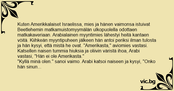Kuten Amerikkalaiset Israelissa, mies ja hänen vaimonsa istuivat Beetlehemin matkamuistomyymälän ulkopuolella odottaen matkakaveriaan. Arabialainen myyntimies lähestyi heitä kantaen vöitä. Kiihkeän myyntipuheen jälkeen hän antoi periksi ilman tulosta ja hän kysyi, että mistä he ovat. "Amerikasta," aviomies vastasi. Katsellen naisen tummia hiuksia ja oliivin väristä ihoa, Arabi vastasi, "Hän ei ole Amerikasta."