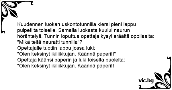 Kuudennen luokan uskontotunnilla kiersi pieni lappu pulpetilta toiselle. Samalla luokasta kuului naurun hörähtelyä. Tunnin loputtua opettaja kysyi eräältä oppilaalta: