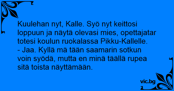 Kuulehan nyt, Kalle. Syö nyt keittosi loppuun ja näytä olevasi mies, opettajatar totesi koulun ruokalassa Pikku-Kallelle.