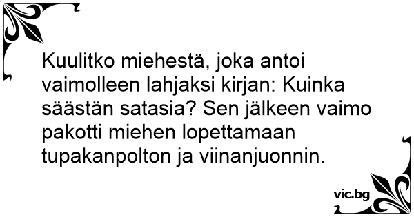 Kuulitko miehestä, joka antoi vaimolleen lahjaksi kirjan: Kuinka säästän satasia? Sen jälkeen vaimo pakotti miehen lopettamaan tupakanpolton ja viinanjuonnin.