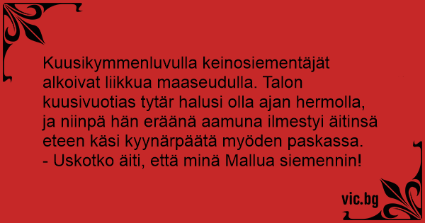 Kuusikymmenluvulla keinosiementäjät alkoivat liikkua maaseudulla. Talon kuusivuotias tytär halusi olla ajan hermolla, ja niinpä hän eräänä aamuna ilmestyi äitinsä eteen käsi kyynärpäätä myöden paskassa.