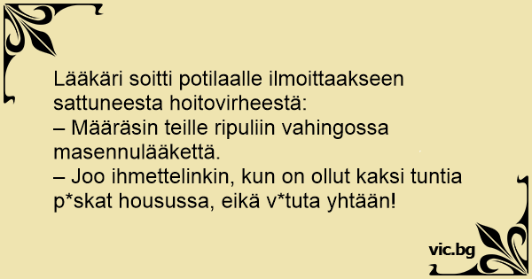– Joo ihmettelinkin, kun on ollut kaksi tuntia p*skat housussa, eikä v*tuta yhtään!