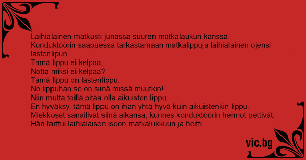 Konduktöörin saapuessa tarkastamaan matkalippuja laihialainen ojensi lastenlipun.