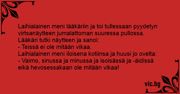 Laihialainen meni lääkäriin ja toi tullessaan pyydetyn virtsanäytteen jumalattoman suuressa pullossa. Lääkäri tutki näytteen ja sanoi: