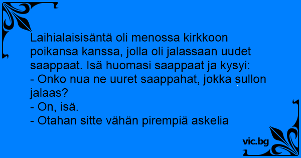 Laihialaisisäntä oli menossa kirkkoon poikansa kanssa, jolla oli jalassaan uudet saappaat. Isä huomasi saappaat ja kysyi: