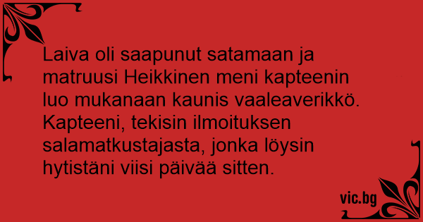Laiva oli saapunut satamaan ja matruusi Heikkinen meni kapteenin luo mukanaan kaunis vaaleaverikkö.