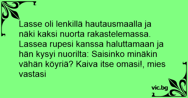 Lasse oli lenkillä hautausmaalla ja näki kaksi nuorta rakastelemassa. Lassea rupesi kanssa haluttamaan ja hän kysyi nuorilta: Saisinko minäkin vähän köyriä? Kaiva itse omasi!, mies vastasi