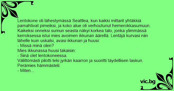 Lentokone oli lähestymässä Seattlea, kun kaikki mittarit yhtäkkiä pamahtivat pimeiksi, ja koko alue oli verhoutunut hernerokkasumuun. Kaikeksi onneksi sumun seasta näkyi korkea talo, jonka ylimmässä kerroksessa istui mies avoimen ikkunan äärellä. Lentäjä kurvasi niin lähelle kuin uskalsi, avasi ikkunan ja huusi: