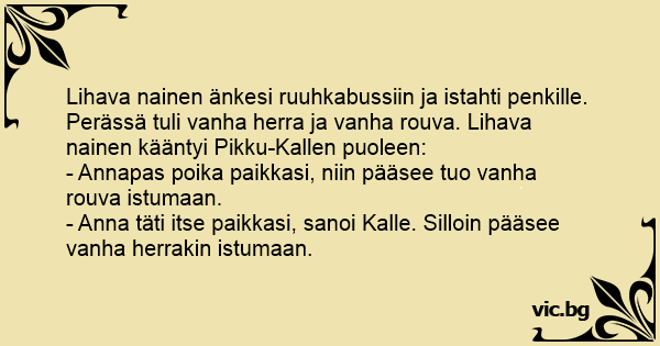 Lihava nainen änkesi ruuhkabussiin ja istahti penkille. Perässä tuli vanha herra ja vanha rouva. Lihava nainen kääntyi Pikku-Kallen puoleen: