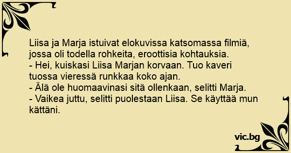 Liisa ja Marja istuivat elokuvissa katsomassa filmiä, jossa oli todella rohkeita, eroottisia kohtauksia.