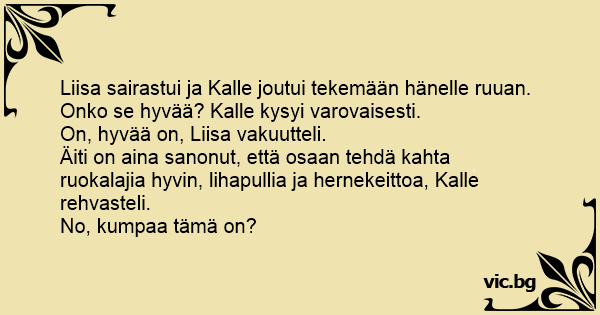 Liisa sairastui ja Kalle joutui tekemään hänelle ruuan. Onko se hyvää? Kalle kysyi varovaisesti. On, hyvää on, Liisa vakuutteli. Äiti on aina sanonut, että osaan tehdä kahta ruokalajia hyvin, lihapullia ja hernekeittoa, Kalle rehvasteli. No, kumpaa tämä on?