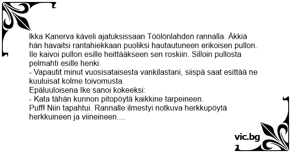 lkka Kanerva käveli ajatuksissaan Töölönlahden rannalla. Äkkiä hän havaitsi rantahiekkaan puoliksi hautautuneen erikoisen pullon. Ile kaivoi pullon esille heittääkseen sen roskiin. Silloin pullosta pelmahti esille henki.