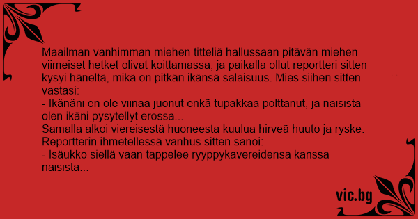 Maailman vanhimman miehen titteliä hallussaan pitävän miehen viimeiset hetket olivat koittamassa, ja paikalla ollut reportteri sitten kysyi häneltä, mikä on pitkän ikänsä salaisuus. Mies siihen sitten vastasi: