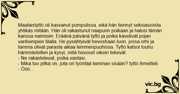 - Mikä tuo pitkä on, jota ori työntää tamman sisään? tyttö ihmetteli.