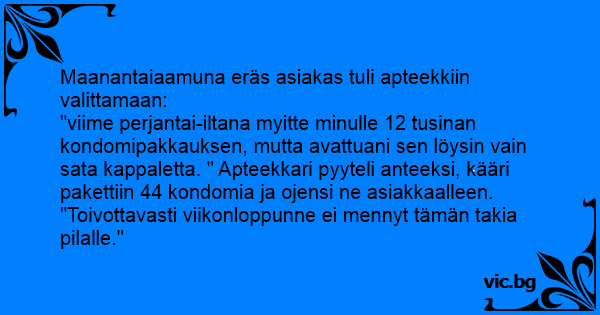 "viime perjantai-iltana myitte minulle 12 tusinan kondomipakkauksen, mutta avattuani sen löysin vain sata kappaletta. " Apteekkari pyyteli anteeksi, kääri pakettiin 44 kondomia ja ojensi ne asiakkaalleen. "Toivottavasti viikonloppunne ei mennyt tämän takia pilalle."