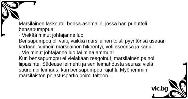 Marsilainen laskeutui bensa-asemalle, jossa hän puhutteli bensapumppua: