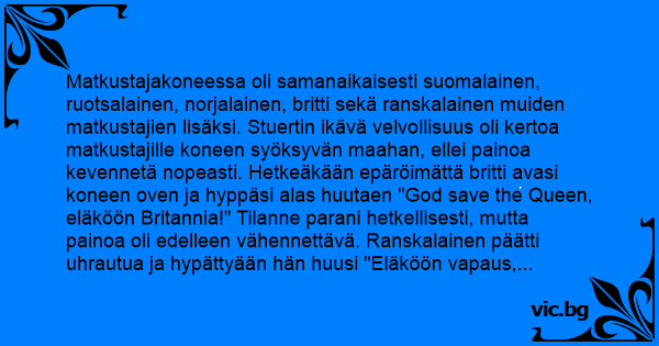 Matkustajakoneessa oli samanaikaisesti suomalainen, ruotsalainen, norjalainen, britti sekä ranskalainen muiden matkustajien lisäksi. Stuertin ikävä velvollisuus oli kertoa matkustajille koneen syöksyvän maahan, ellei painoa kevennetä nopeasti. Hetkeäkään epäröimättä britti avasi koneen oven ja hyppäsi alas huutaen "God save the Queen, eläköön Britannia!" Tilanne parani hetkellisesti, mutta painoa oli edelleen vähennettävä. Ranskalainen päätti uhrautua ja hypättyään hän huusi "Eläköön vapaus, veljeys ja tasa-arvo, eläköön Ranska!" Vielä oli kuitenkin yhden matkustajan poistuttava koneesta. Norjalainen katsoi suomalaista ja tämä norjalaista, molemmat tempaisivat yhteistuumin ruotsalaisen ulos koneesta huutaen "Eläköön pohjoismainen yhteistyö!