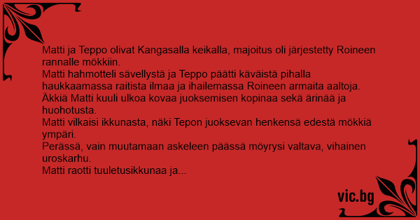 Matti ja Teppo olivat Kangasalla keikalla, majoitus oli järjestetty Roineen rannalle mökkiin.