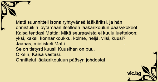 Matti suunnitteli isona ryhtyvänsä lääkäriksi, ja hän onnistuikin löytämään itselleen lääkärikoulun pääsykokeet.