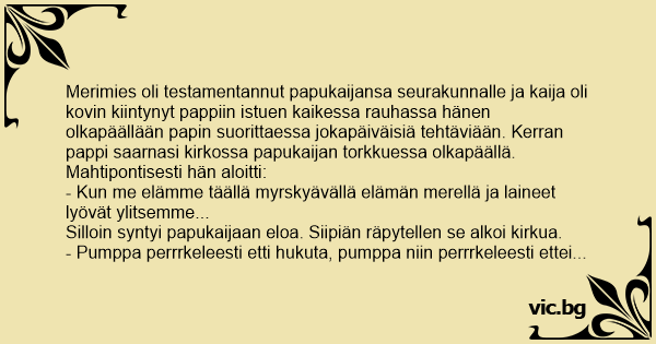 Merimies oli testamentannut papukaijansa seurakunnalle ja kaija oli kovin kiintynyt pappiin istuen kaikessa rauhassa hänen olkapäällään papin suorittaessa jokapäiväisiä tehtäviään. Kerran pappi saarnasi kirkossa papukaijan torkkuessa olkapäällä. Mahtipontisesti hän aloitti: