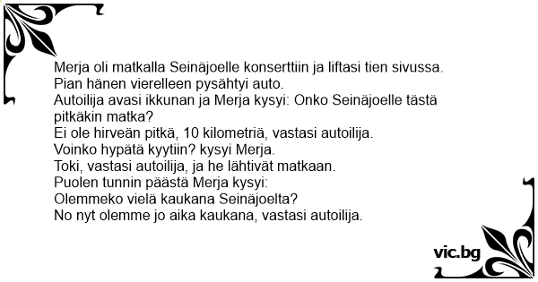 Autoilija avasi ikkunan ja Merja kysyi: Onko Seinäjoelle tästä pitkäkin matka?