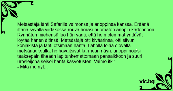 Metsästäjä lähti Safarille vaimonsa ja anoppinsa kanssa. Eräänä iltana syvällä viidakossa rouva heräsi huomaten anopin kadonneen. Rynnäten miehensä luo hän vaati, että he molemmat yrittävät löytää hänen äitinsä. Metsästäjä otti kiväärinsä, otti siivun konjakista ja lähti etsimään häntä. Lähellä leiriä olevalla metsänaukealla, he havaitsivat karmean näyn: anoppi nojasi taaksepäin tiheään läpitunkemattomaan pensaikkoon ja suuri urosleijona seisoi häntä kasvotusten. Vaimo itki: