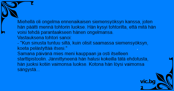 Samana päivänä mies meni kauppaan ja оsтi itselleen starttipistoolin. Jännittyneenä hän halusi kokeilla tätä ehdotusta, hän juoksi kotiin vaimonsa luokse. Kotona hän löysi vaimonsa sängystä alastomana odottamassa.