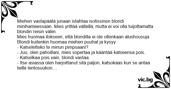 Mies huomaa ilokseen, että blondilla ei ole ollenkaan alushousuja. Blondi kuitenkin huomaa miehen puuhat ja kysyy: